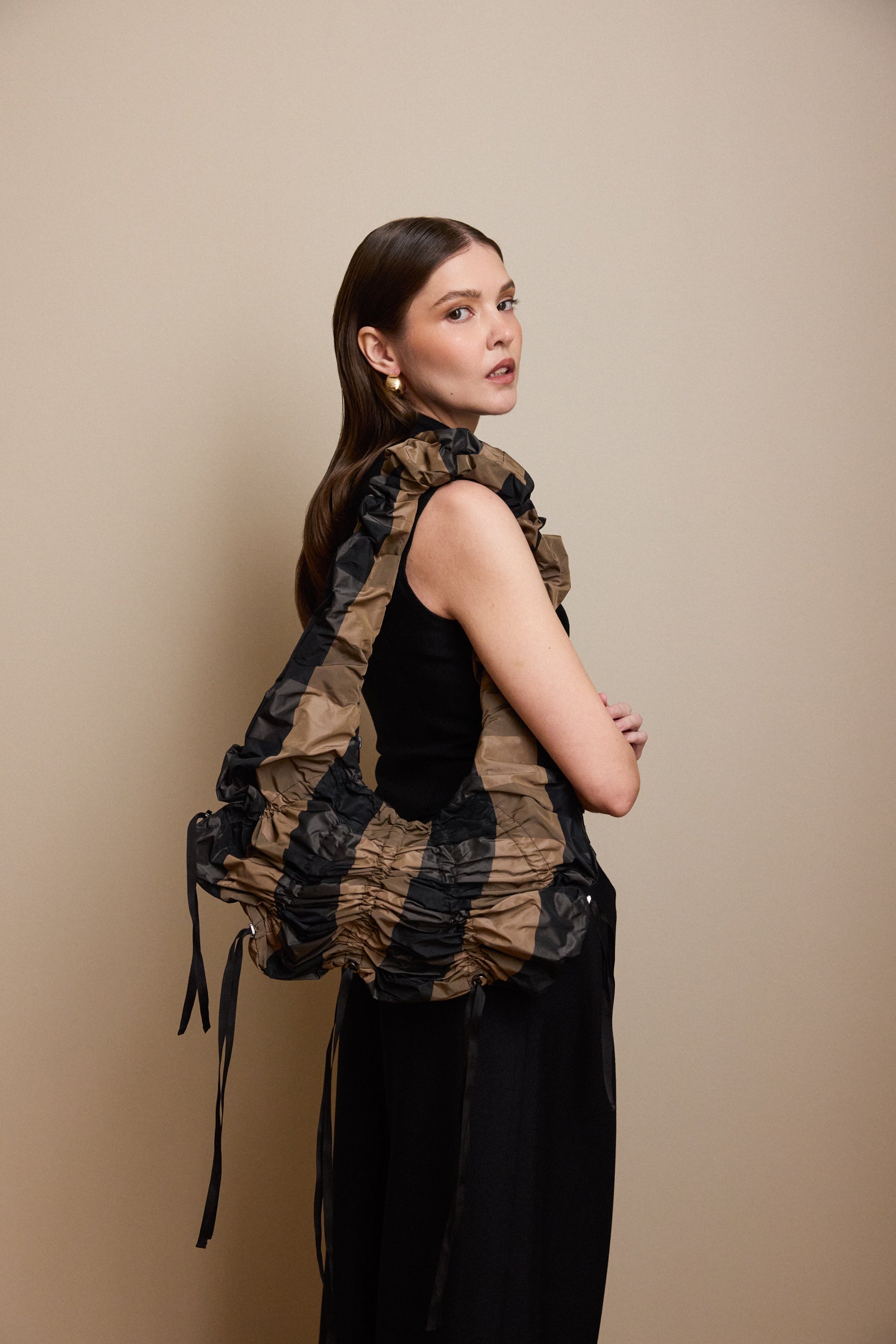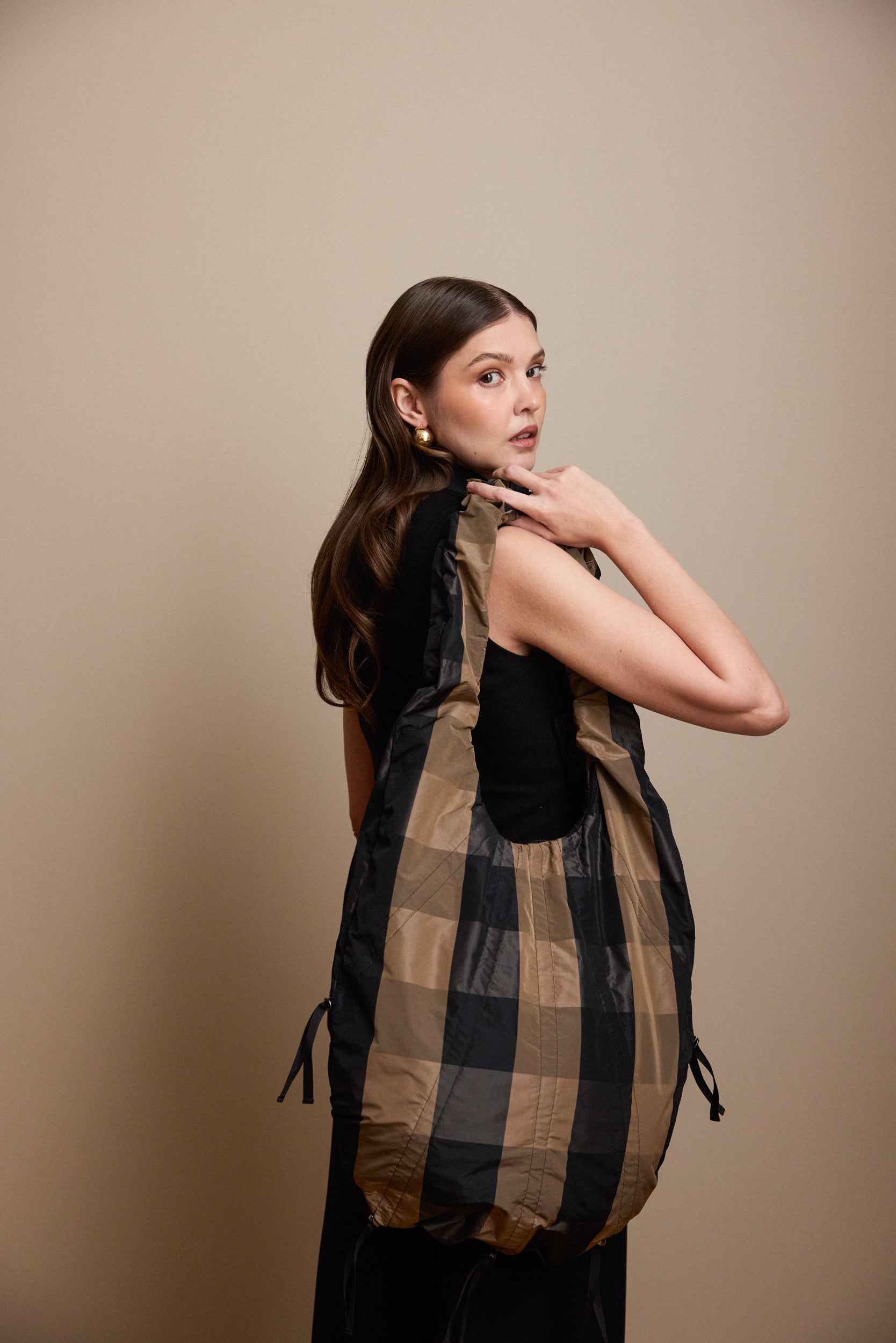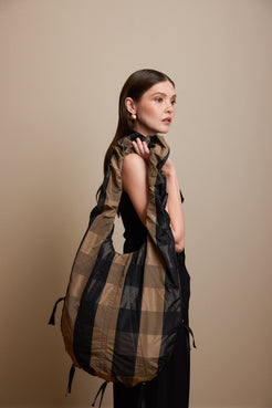 The new XL drawstring bag with adjustable strings, crafted from waterproof deadstock fabric. Offers versatile styling and size options for any occasion, easily transitioning from day to night. Secure zip-closure for added convenience. Carry it by hand or on the shoulder.