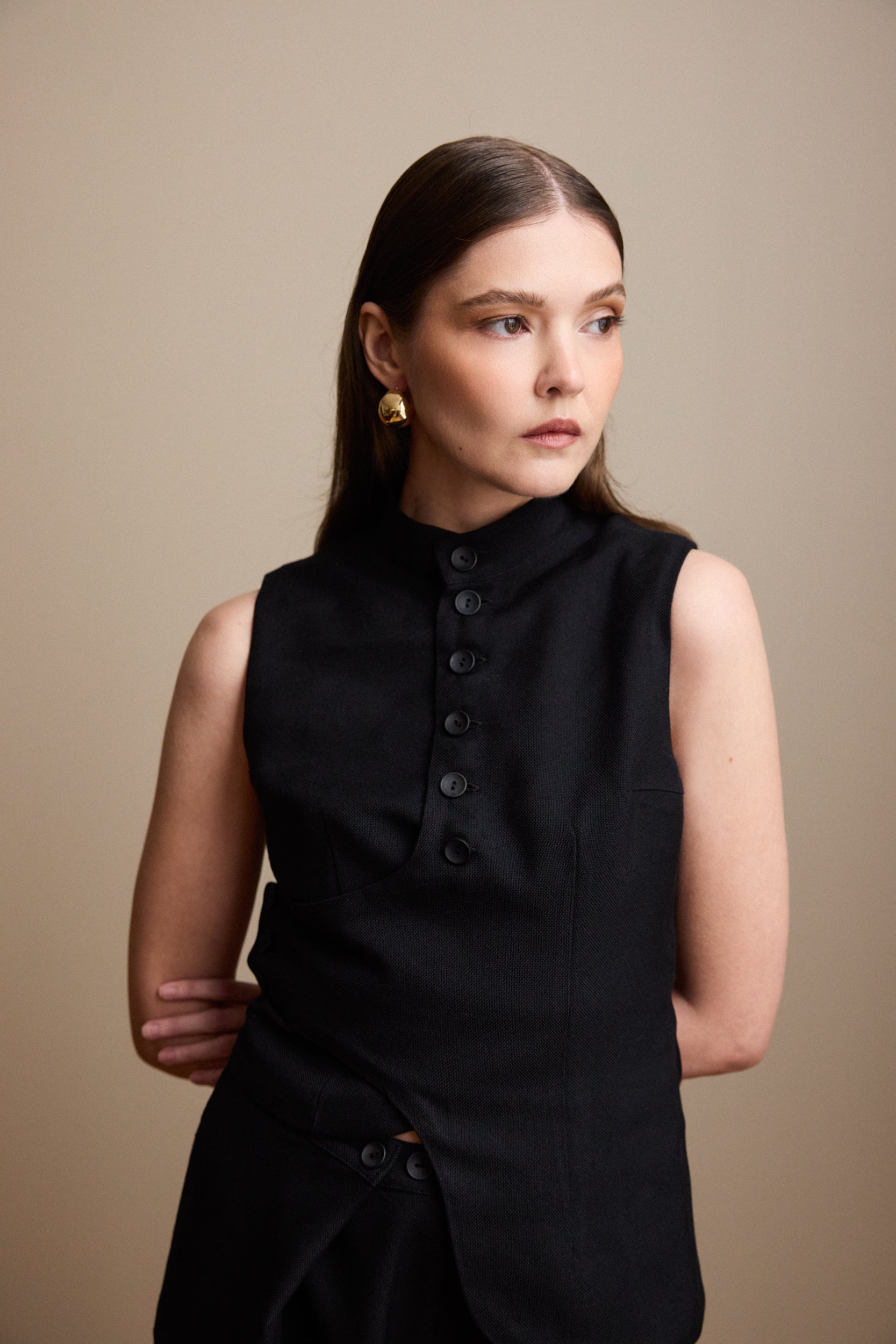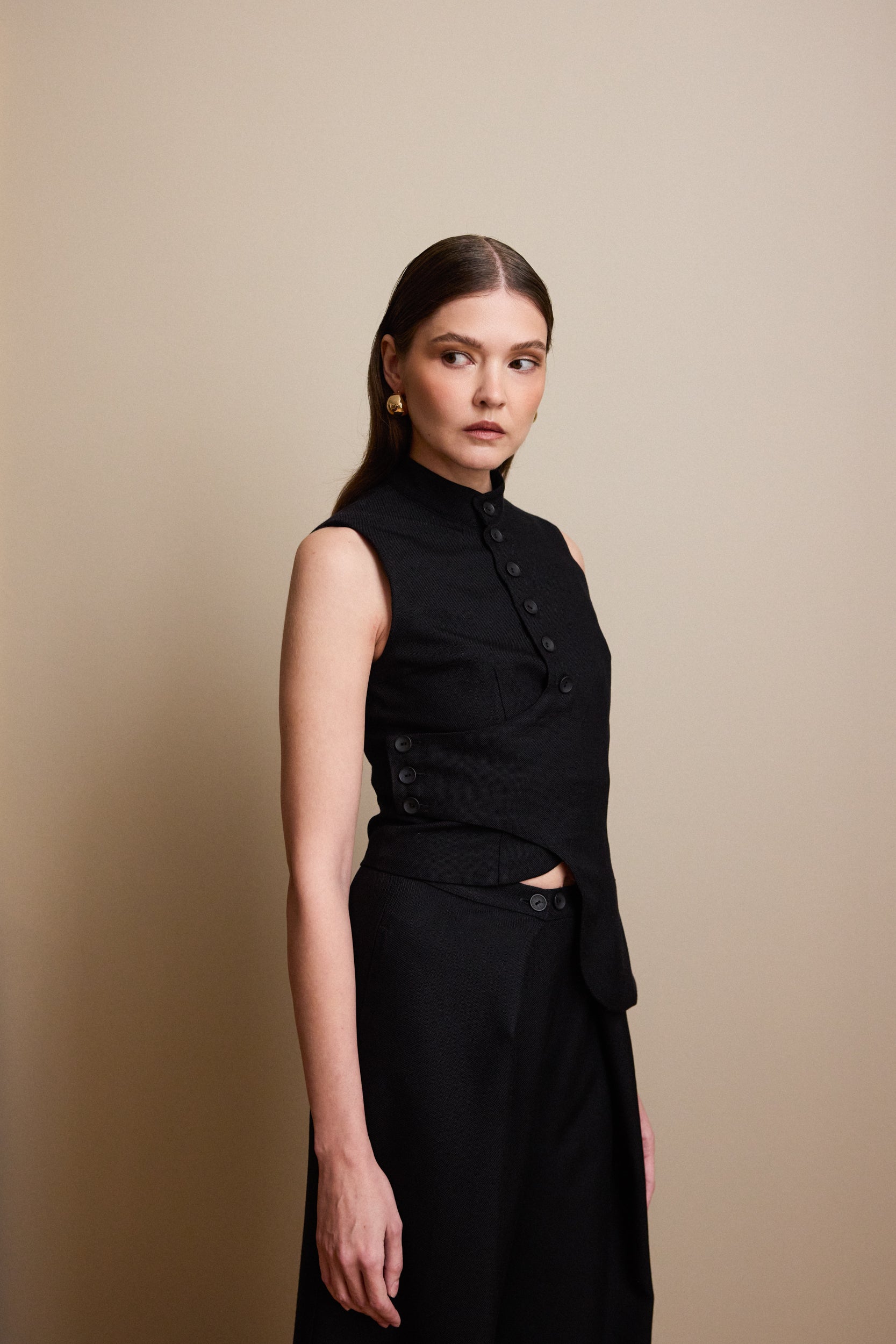 Black wool silk & cashmere natté vest. Designed with a tailored fit and mandarin collar, featuring an asymmetric hem for a unique form. The button-up front and side closure ensure a refined fit. Fully lined interior for comfort. Wear as a set with the Wool Silk & Cashmere pants for an office look or a more formal style.