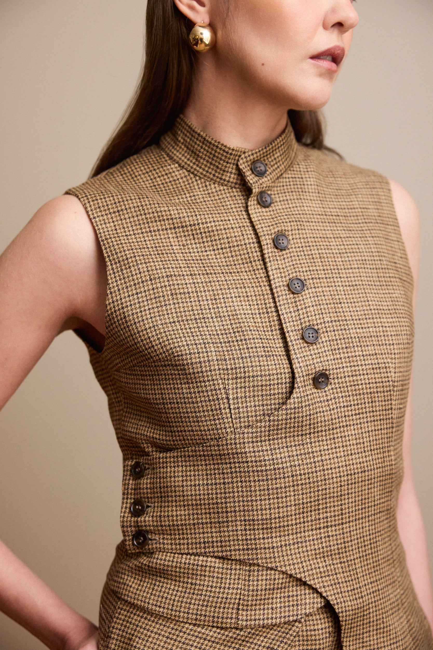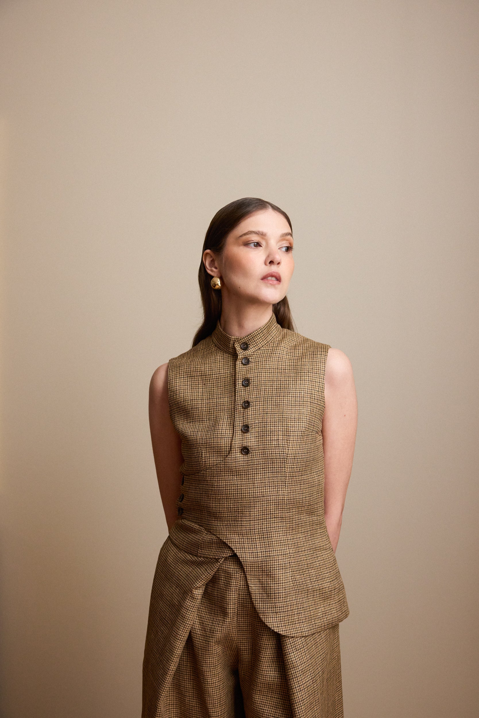 Silk & Linen houndstooth vest. Designed with a tailored fit and mandarin collar, featuring an asymmetric hem for a unique form. The button-up front and side closure ensure a refined fit. Fully lined interior for comfort. Wear as a set with the Silk & Linen pants for an office look or a more formal style.